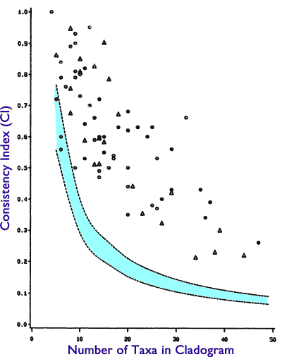 Par exemple, un CI de 0,2 est attendu à partir de données aléatoires pour 20 taxons. Une valeur de 0,3 est toutefois hautement significative sur le plan statistique. Le point le plus intéressant pour le moment est le fait qu’un IC de 0,1 pour 20 taxons est également très significatif sur le plan statistique, mais trop bas - il est révélateur d’une structure anticladistique. Klassen et al. ont pris 75 valeurs de CI provenant de cladogrammes publiés en 1989 (combinées de trois articles) et ont indiqué comment elles se comportaient en termes de signification statistique. Les cladogrammes utilisaient de 5 à 49 taxons différents (c’est-à-dire des espèces différentes). Trois des 75 cladogrammes se situaient dans les limites de confiance de 95% pour les données aléatoires, ce qui signifie qu'il était impossible de les distinguer des données aléatoires. Tous les autres ont présenté des valeurs hautement significatives sur le plan statistique de l'IC. Aucun n'a montré des valeurs significativement basses; aucune ne présentait un modèle anti-corrélé, anti-hiérarchique.