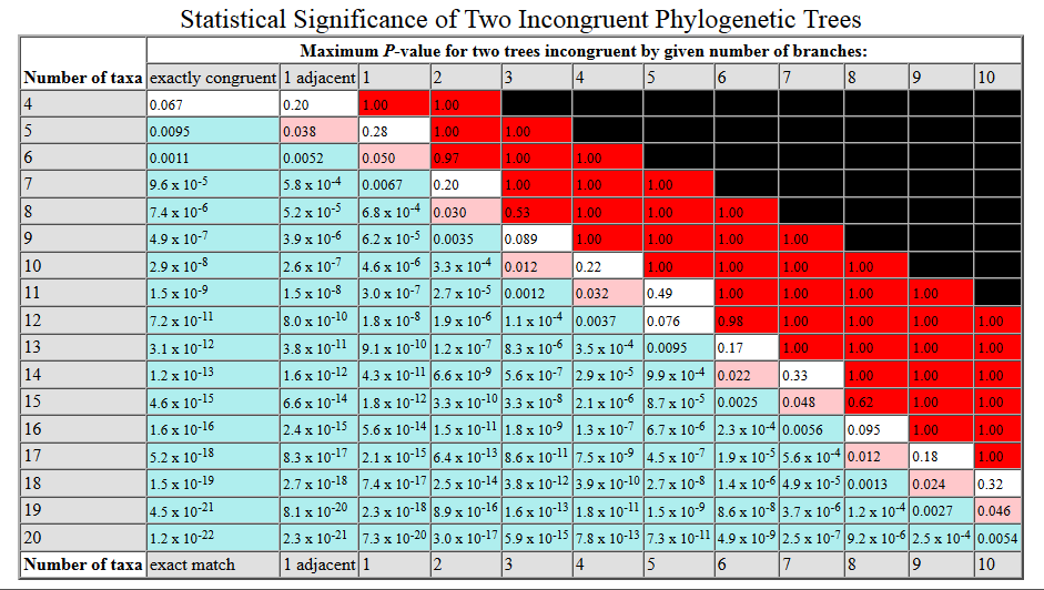 Dans le tableau ci-dessous, les lignes répertorient les valeurs permettant de comparer deux arbres comportant un nombre croissant de taxons. Les colonnes énumèrent la signification pour un nombre donné de différences entre les deux arbres. L'incongruence de “1 adjacent” fait référence au cas où une branche diverge par un seul nœud adjacent (c'est-à-dire que deux branches adjacentes sont échangées par rapport à l'autre arbre). Les colonnes 1 à 10 restantes font référence au cas où x branches ou moins sont mal placées n'importe où dans l'arbre. Une signification statistique élevée (P <0,01 ou une confiance supérieure à 99%) est indiquée en bleu clair. La signification statistique (p <0,05 ou plus de 95% de confiance) est indiquée en rose. Les valeurs équivoques (0,05 <P <0,50) sont indiquées en blanc. Les valeurs très insignifiantes (P> 0,50) sont indiquées en rouge et les valeurs impossibles en noir.