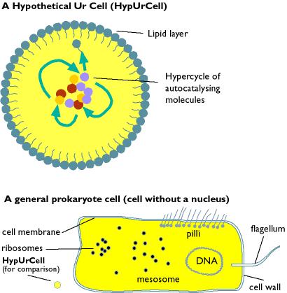 Deuxièmement, la prémisse dans son ensemble est incorrect pour commencer, parce que dans les théories modernes de l'abiogenèse, les premiers «êtres vivants» seraient beaucoup plus simples, pas même des protobactéries ou des pré-protobactéries (ce qu'Oparin appelait un protobiont [8] et Woese appelle un progénote [4]), mais une ou plusieurs molécules simples ne dépassent probablement pas 30 à 40 sous-unités. Ces molécules simples ont ensuite évolué lentement vers des systèmes d'autoréplication plus coopératifs, puis finalement vers des organismes simples [2, 5, 10, 15, 28]. Une illustration comparant un protobionte hypothétique et une bactérie moderne est donnée ci-dessous.