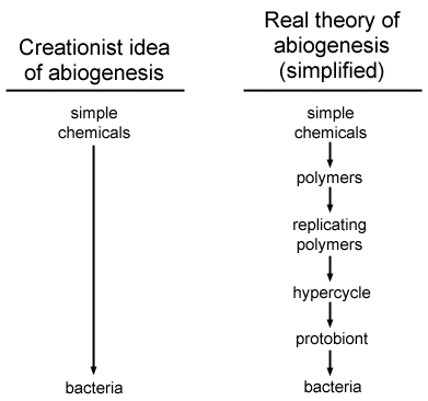 Que les premiers auto-réplicateurs soient des molécules uniques ou des complexes de petites molécules, ce modèle n'a rien à voir avec la “tornade de Hoyle dans une décharge construisant un 747”. Juste pour marteler cette différence, voici une comparaison simple de la théorie critiquée par les créationnistes et de la théorie réelle de l'abiogenèse.